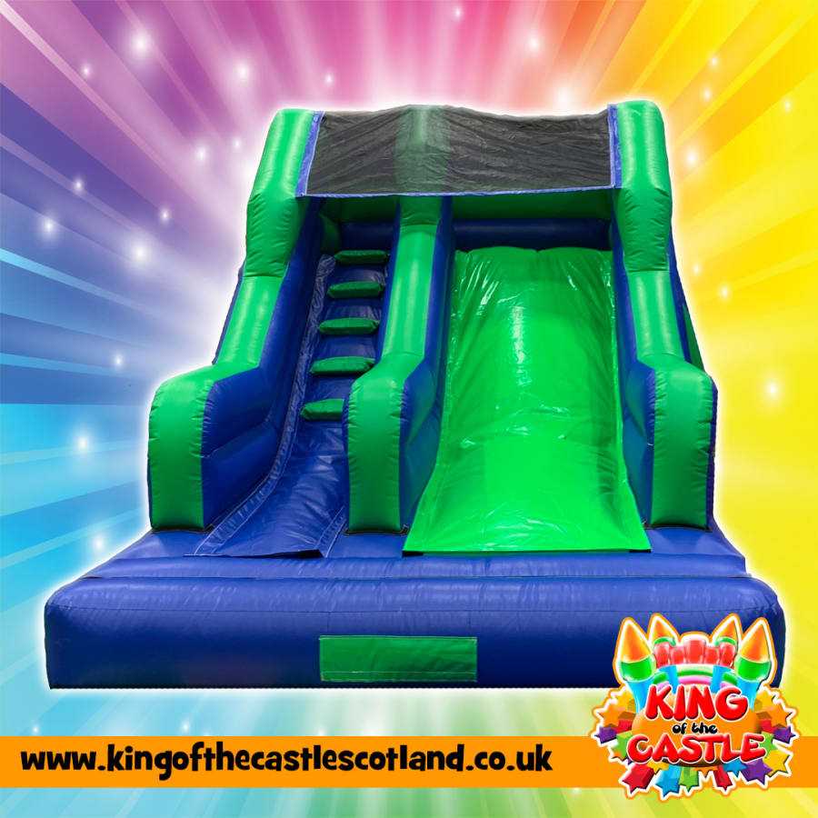 Big thrills in a compact space. This green and blue party slide is always popular!
